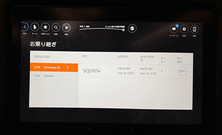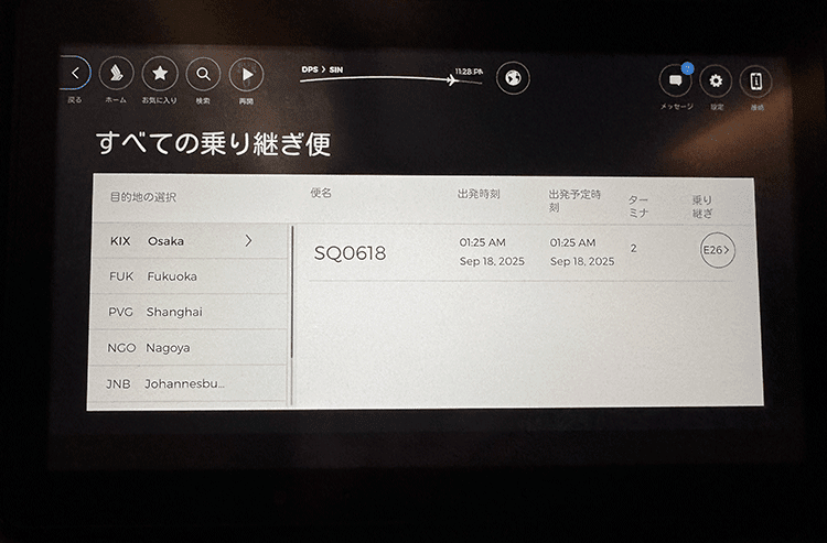SQ623のモニターには到着ゲートと乗り継ぎ便のゲートが表示されます♪
