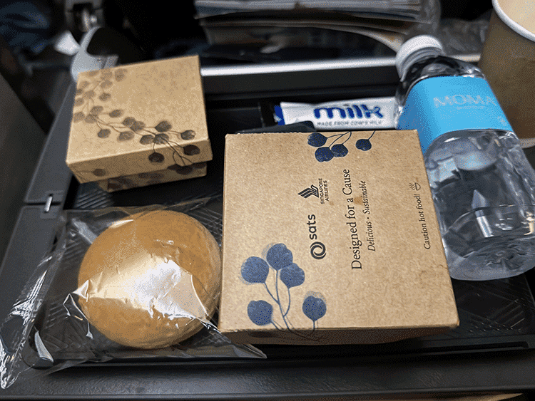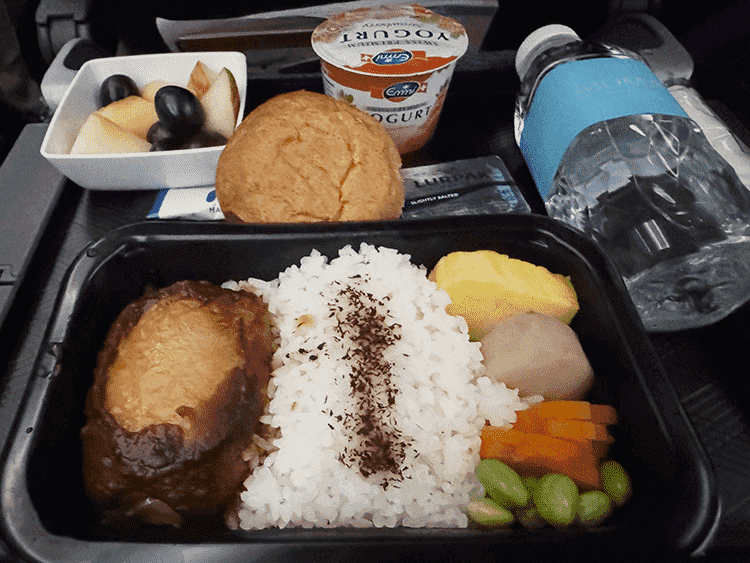 SQ918便は、シンガポールを01:25発、関空着08:50です。到着の2時間前くらいに朝食タイムです。和風チキンライスを頂きました。
