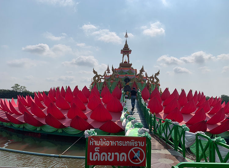 ピンクガネーシャの前の川にある赤の蓮のモニュメント